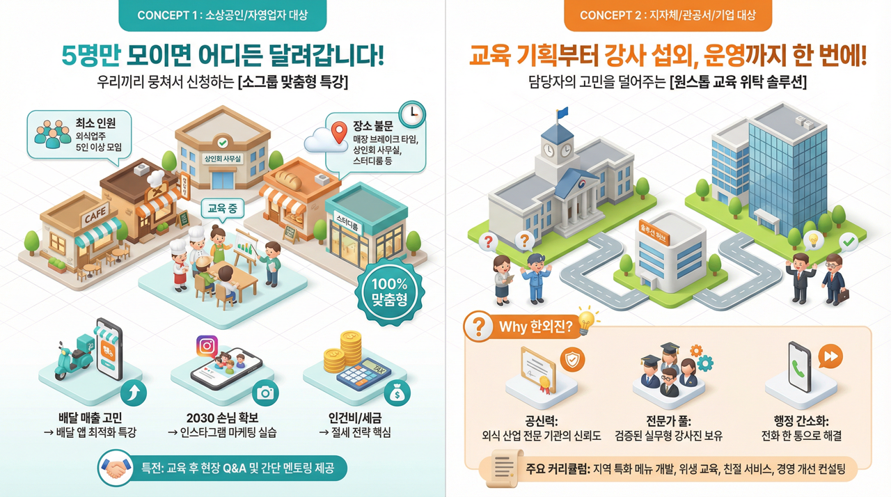 (사)한국외식산업진흥원의 '찾아가는 외식교육'은 교육 참석이 어려운 바쁜 외식업주와 실무자들을 위해 기획되었습니다.