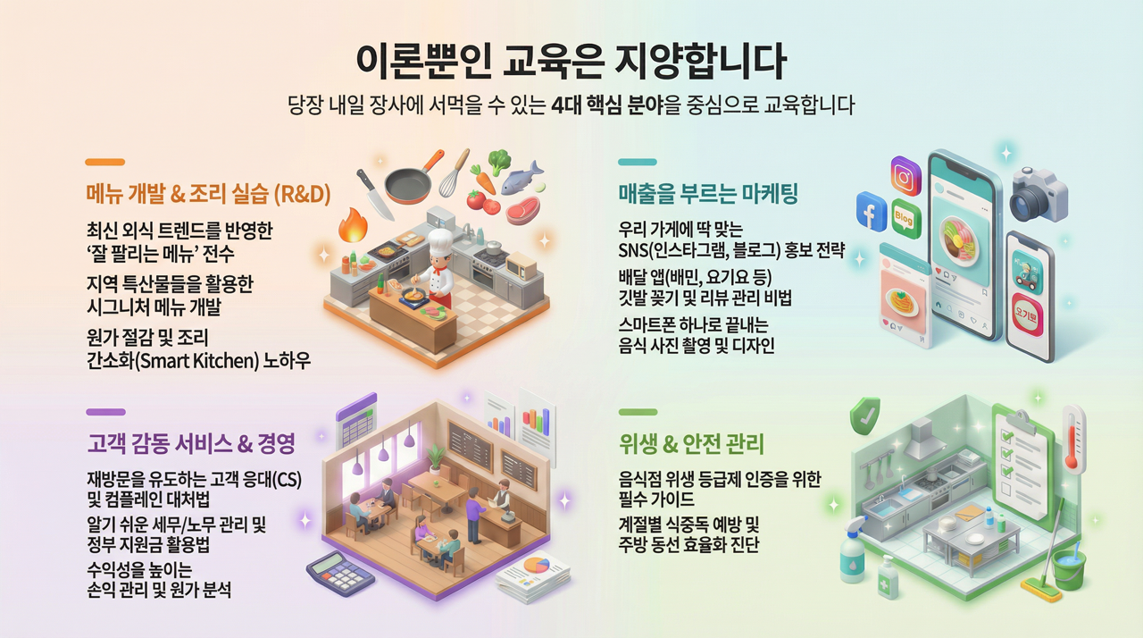 이론뿐인 교육은 지양합니다. 당장 내일 장사에 써먹을 수 있는 4대 핵심 분야를 중심으로 교육합니다.