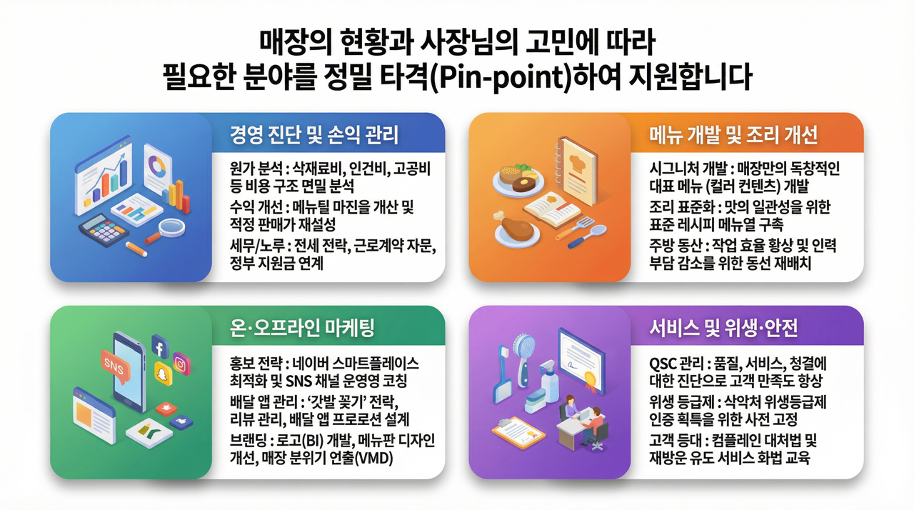 매장의 현황과 사장님의 고민에 따라 필요한 분야를 정밀 타격(Pin-point)하여 지원합니다.