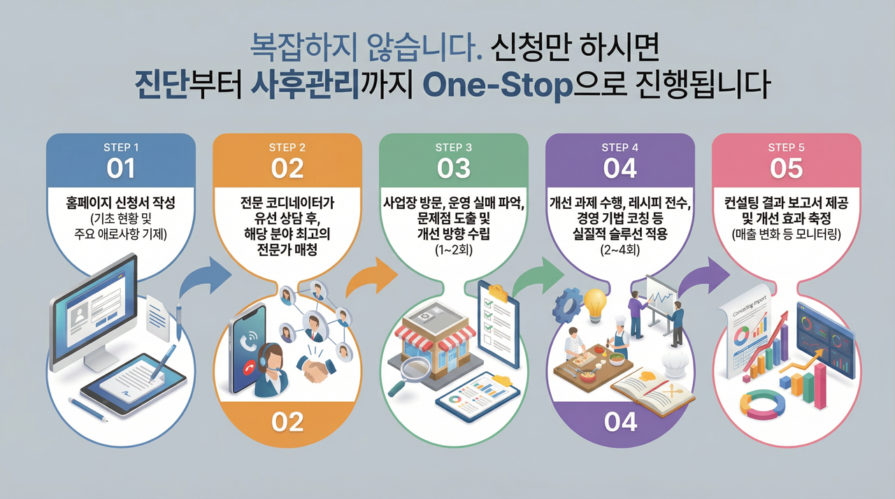 복잡하지 않습니다. 신청만 하시면 진단부터 사후관리까지 One-Stop으로 진행됩니다.