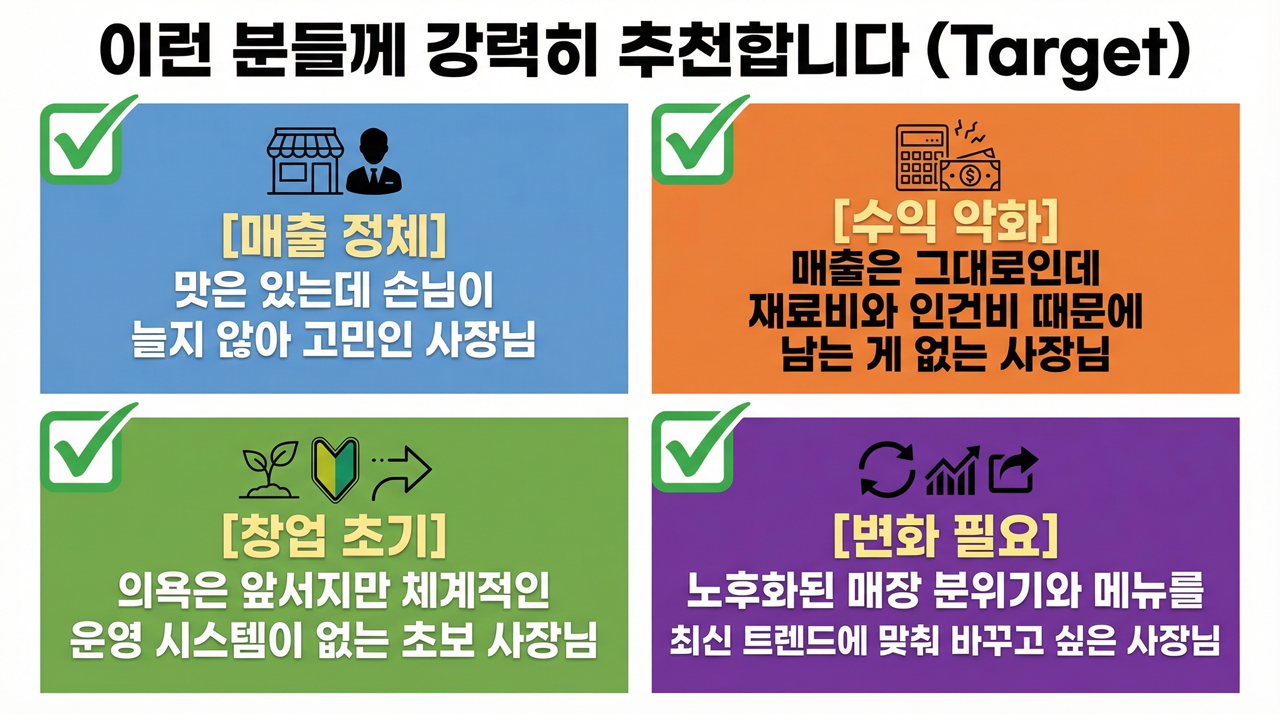 한국외식산업진흥원은 획일화된 이론이 아닌, 철저한 현장 중심의 1:1 맞춤 솔루션을 제공합니다.